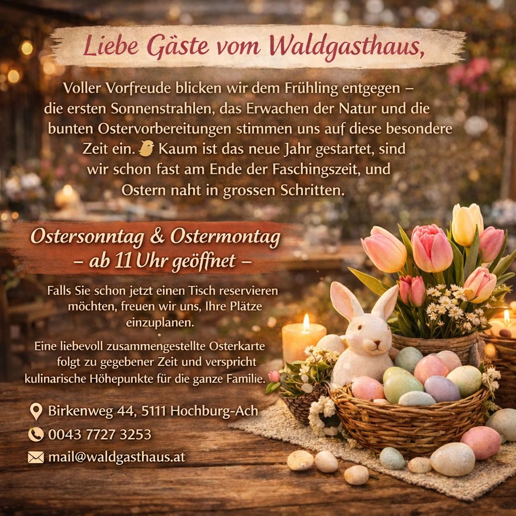 Adresse:WaldgasthausMarek DudaBirkenweg 445122 Hochburg-AchTel.: +43 7727 3253Handy: +43 676 4511 213E-Mail: mail@waldgasthaus.at
